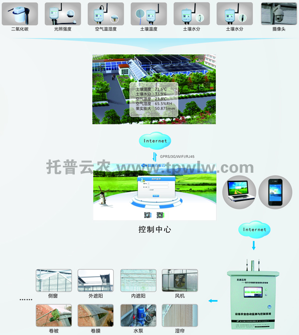 ?????? 2014年上半年,為了加快基地早日實現智能化、規模化、標準化、容器化生產,順應我國園藝生產發展的方向,德清綠色陽光農業生態有限公司開始著手于基地種植與托普物聯網聯姻。物聯網系統嚴格的環境條件與種植條件管控,不僅解決了傳統容器苗生產依靠人工經驗管理而產生的誤差問題,同時還減少了人力成本高、縮短了種苗生長周期。??????? 托普云農物聯網系統采集溫室內空氣溫濕度、土壤水分、土壤溫度、二氧化碳、光照強度等實時環境數據,通過中繼節點傳輸到控制中心,由中心平臺系統將最新監測數據與預先設定適合農作物生長的環境參數作對比,若出現偏差,計算機會自動發送至指令,智能啟動與系統相連的通風機、遮陽、加濕、澆灌等設備進行工作,直到各數據恢復到正常范圍之內。