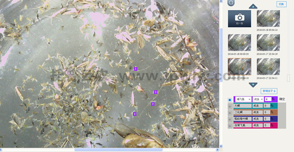 通過遠程可拍照式蟲情測報燈采集到的蟲情照片,可設置拍照時間定時上傳,也可隨時遠程拍照,即拍即看。高清照片清晰查看蟲情狀況,更有蟲情識別軟件自動識別稻飛虱、二化螟等水稻類蟲害,自動計數。