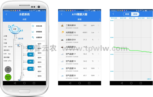 手機端可更方便的實現遠程監管與管控。可實現園區內各個監測點數據查看查詢,曲線列表直觀呈現;水肥設備、風機、遮陽、補光等遠程控制;也可查看蟲情圖片,了解園區蟲情情況等軟件監管平臺所有功能,真正實現多終端管理,優化管理方式。
