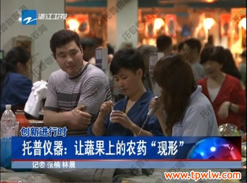 圖為:浙江新聞聯(lián)播報(bào)道正在檢測(cè)蔬菜農(nóng)殘的攤主