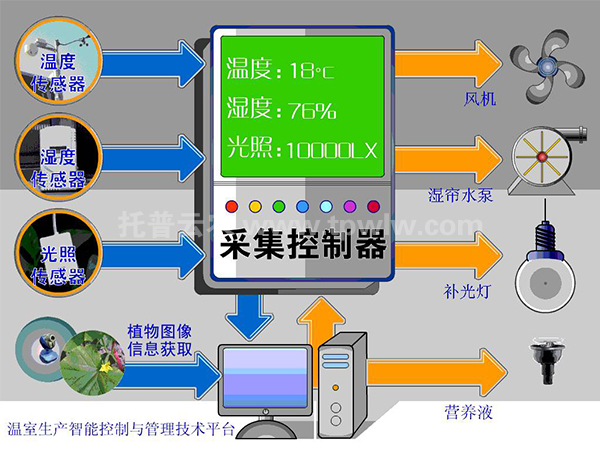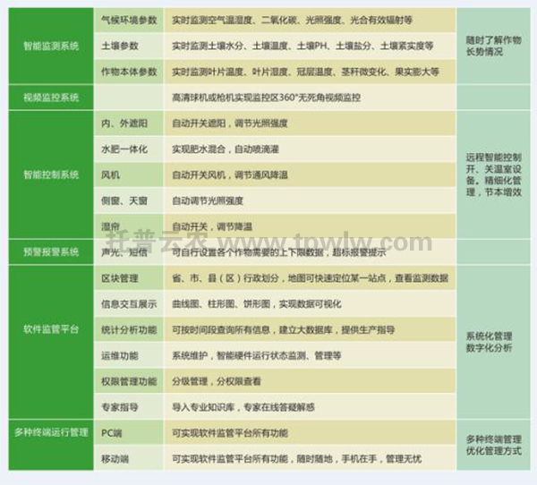 智能化溫室擁有溫室環(huán)境智能監(jiān)控系統(tǒng),可以準(zhǔn)確地采集溫室內(nèi)大氣溫濕度、土壤溫濕度、光照強(qiáng)度、溶液濃度、二氧化碳濃度、風(fēng)向、風(fēng)速以及作物生長(zhǎng)狀況等參數(shù),將室內(nèi)溫、光、水、肥、氣等諸多因素綜合,根據(jù)不同作物、作物不同生長(zhǎng)階段對(duì)環(huán)境因子的不同要求,通過(guò)執(zhí)行機(jī)構(gòu)協(xié)調(diào)到最佳狀態(tài),節(jié)能最高可達(dá)50%,并有節(jié)水、節(jié)肥、節(jié)藥的效果。