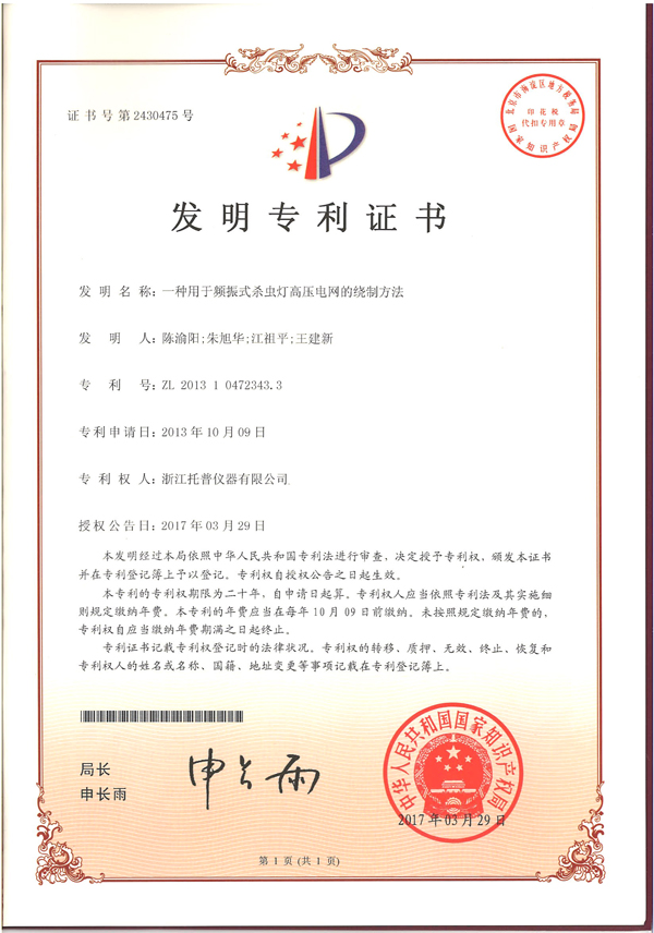 - 托普云農(nóng)又喜獲發(fā)明專利發(fā)表日期:2017-04-14 來源:托普云農(nóng) 瀏覽次數(shù):4529次近日,我司托普云農(nóng)又喜獲一項發(fā)明專利。據(jù)悉,該發(fā)明專利名稱為“一種用于頻振式殺蟲燈高壓電網(wǎng)的繞制方法”,發(fā)明專號為ZL201310472343.3。相較于傳統(tǒng)的殺蟲燈繞制方法,“一種用于頻振式殺蟲燈高壓電網(wǎng)的繞制方法”是一種用專門設計的螺旋繞線機實現(xiàn)殺蟲燈高壓電網(wǎng)繞線的方法。該發(fā)明專利于2013年10月9日向國家知識產(chǎn)權局申請,并于2017年3月29日正式得到授權。據(jù)業(yè)內(nèi)專家評價,該專利由于電網(wǎng)間距由螺桿螺距保證,使得繞制后的電網(wǎng)間距均勻一致。此外,繞制方法操作方便,繞制效率高且繞線緊致不易松落造成短路,具有良好的普及運用價值。