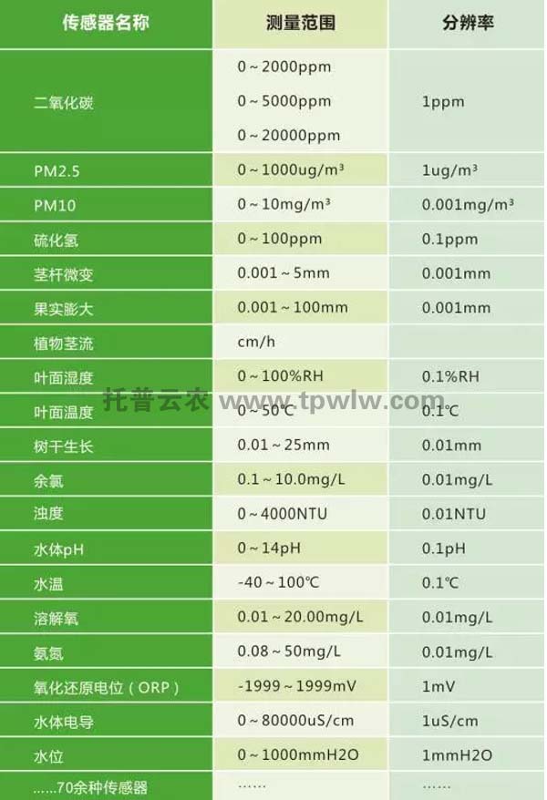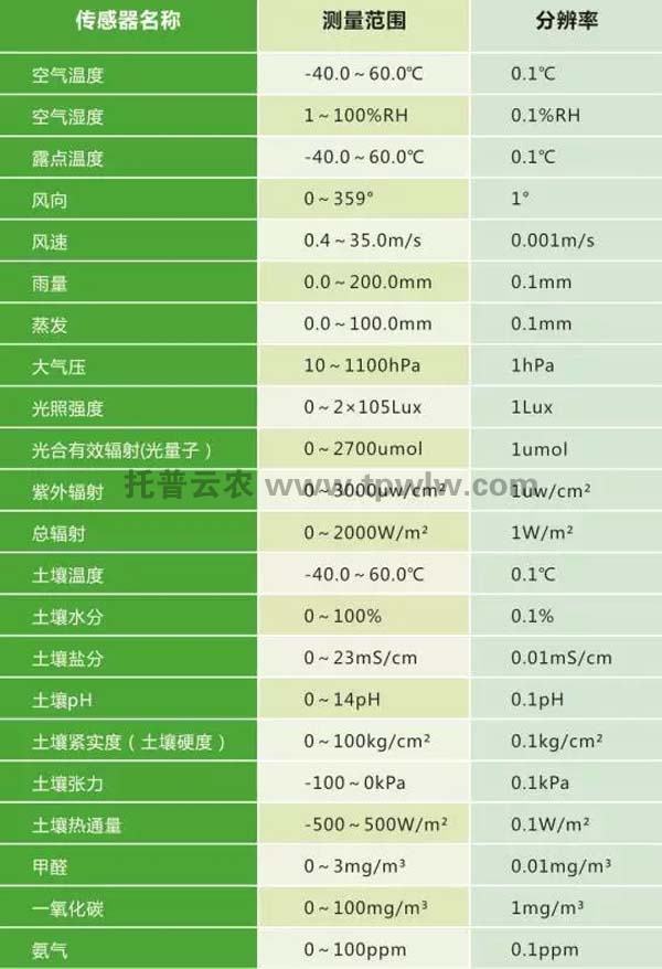 在農業氣象方面,目前有空氣溫度、濕度、光照強度、光合有效輻射、二氧化碳、雨量、蒸發、風速風向、大氣壓、總輻射、紫外輻射等傳感器。同時,還有應用于畜禽養殖監測的氨氣、硫化氫等傳感器,應用于水質監測的pH、余氯、濁度、溶解氧、氨氮、水溫等傳感器,應用于環境監測的一氧化碳、二氧化碳、甲醛、PM2.5、PM10等傳感器。