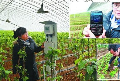 8月24日,管理員在山東省濟南市歷城區唐王鎮高智能溫室大棚內查看智能型農業環境通用采集控制器、展示手機召喚短信。近日,一個由太陽能供電的物聯網農業信息化高智能溫室大棚在唐王鎮建成啟用。該溫室大棚根據不同植物生長條件設定參數,利用棚內設置的氣象百葉箱及光照度、二氧化碳和土壤水分等多個探頭,定時將數據信息傳輸給控制系統,及時對棚內進行調節。如遇到大風、大雨等惡劣天氣超過設定參數時,便會通過手機進行短信報警,實現了遠程監控,確保棚內植物“幸?!弊聣殉砷L。