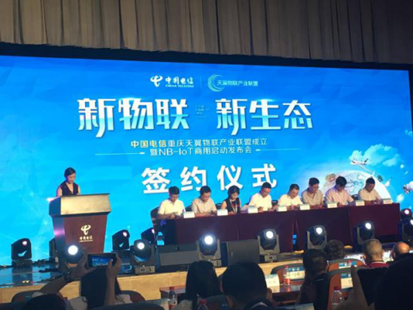 中國電信重慶天翼物聯產業聯盟成立暨NB-IoT商用啟動發布會現場的簽約儀式