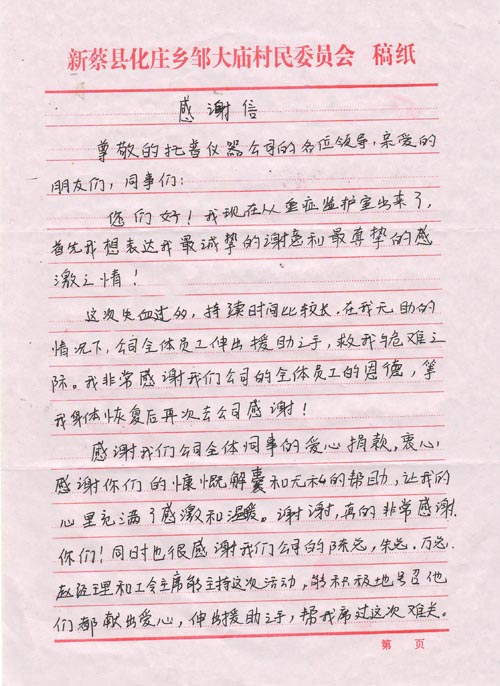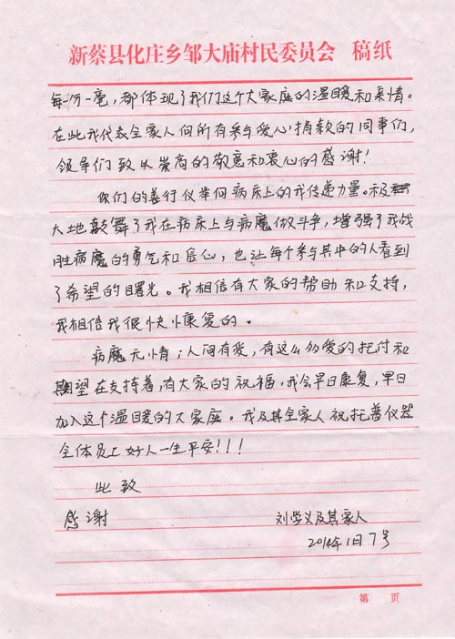 1月15日,公司收到劉學(xué)義寫來的信,信中他告訴托普家人他的病情已好轉(zhuǎn),術(shù)后已由重癥監(jiān)護(hù)室轉(zhuǎn)入普通病房,等待觀察與休養(yǎng)。長(zhǎng)長(zhǎng)的一封信,給同事們帶來了喜悅的消息,也傾訴著他對(duì)托普家人的深深謝意!