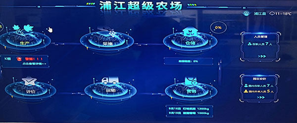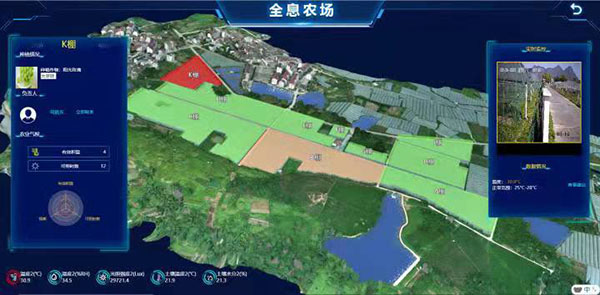 作為智慧農(nóng)業(yè)的升級版本,“超級農(nóng)場”項(xiàng)目對生產(chǎn)經(jīng)營管理等每一個(gè)環(huán)節(jié),都進(jìn)行了嚴(yán)格的監(jiān)管,數(shù)據(jù)采集,實(shí)時(shí)監(jiān)測。通過無人機(jī)的航拍,實(shí)現(xiàn)了對整個(gè)農(nóng)場的3D建模,把整個(gè)農(nóng)場分成A—K,差不多11個(gè)區(qū)塊,然后進(jìn)行區(qū)塊的數(shù)字化監(jiān)控。一塊電子顯示屏就可看到農(nóng)場的所有狀況,葡萄園11個(gè)鋼架大棚所有環(huán)境信息,包括溫度、濕度、土壤酸堿值、光照等情況都呈現(xiàn)在屏幕上。另外,葡萄園里各處分布了多少攝像頭,有多少在職人員,多少外來人員,也都能一目了然。