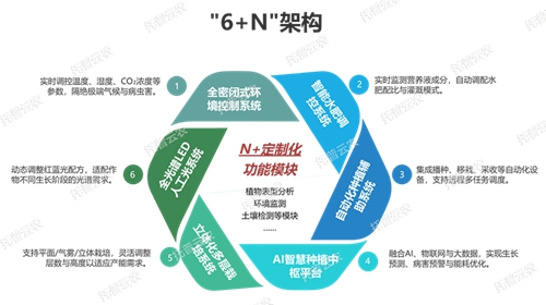 該方案基于"6+N"架構構建:全密閉式環境控制系統精準調控溫濕度及CO?濃度,隔絕外界干擾;全光譜LED光系統動態調整紅藍光配方適配作物生長周期;立體栽培系統通過平面、多層、氣霧模式靈活適配產能需求;智能水肥系統實時監測營養液成分并自動調配灌溉;自動化設備實現播種、移栽、采收全流程無人化操作;AI中樞整合物聯網與大數據,提供生長預測與病害預警;另可擴展植物表型分析、環境監測等N個定制模塊,形成閉環智能生產體系。